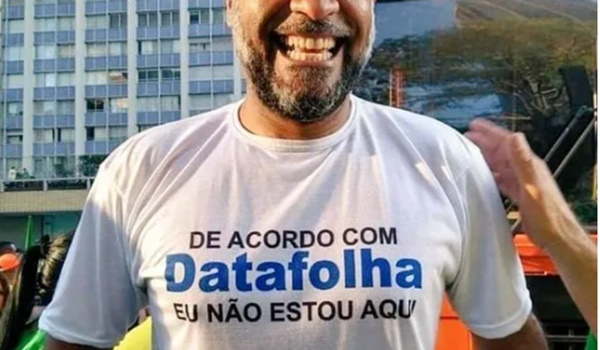 "De acordo com o Datafolha eu não estou aqui", diz a camisa de um manifestante