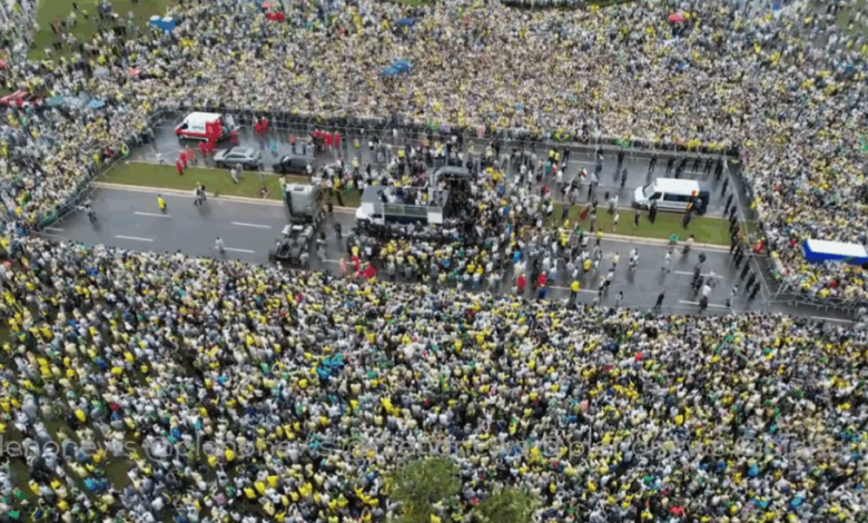 Um vídeo registrado na tarde deste domingo (25) mostra o momento exato em que um raio atinge a concentração de um ato de apoiadores do ex-presidente Jair Bolsonaro na área central de Brasília. A descarga elétrica ocorreu enquanto os manifestantes estavam reunidos nas proximidades do Memorial JK, no Eixo Monumental, sob forte chuva.