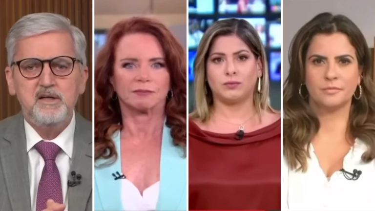 As âncoras Leilane Neubarth e Camila Bonfim pareceram desconcertadas. Já Daniela Lima segurou um sorriso casual no rosto.