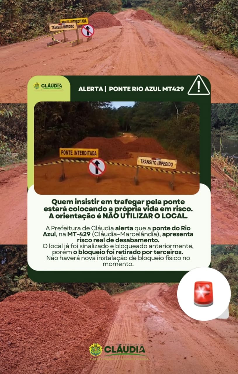 A Prefeitura de Cláudia emitiu um alerta importante à população sobre a situação da ponte do Rio Azul, localizada na MT-429, que liga Cláudia a Marcelândia. De acordo com as autoridades, a estrutura apresenta um risco real de desabamento, e a orientação é clara: evitar o tráfego no local.