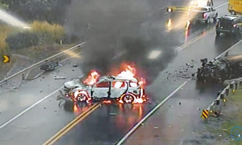 Chovia muito no momento do acidente e a principal suspeita é que tenha havido aquaplanagem por parte de um dos veículos. Os dois carros ficaram totalmente destruídos.