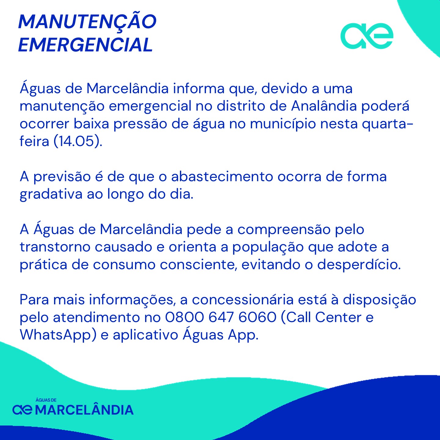 Para mais informações, a concessionária está à disposição pelo atendimento no 0800 647 6060 (Call Center e WhatsApp) e aplicativo Águas App.