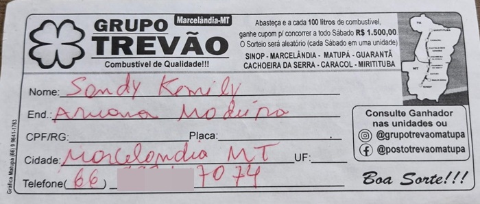 No último sábado, dia 01/11, a jovem Sandy Kemily, residente na Aruanã Madeiras no Setor Industrial, se tornou a grande contemplada de um sorteio realizado pelo Grupo Trevão. Todos os clientes que abasteceram seus veículos no posto com um valor superior a R$ 100,00 ganharam cupons para concorrer a um prêmio em dinheiro de R$ 1.500,00. A iniciativa faz parte das ações promocionais da empresa, que possui filiais nas cidades de Marcelândia-MT, Sinop-MT, Matupá-MT, Guarantã do Norte-MT, Cachoeira da Serra-PA, Caracol-PA, Miritituba-PA, Santarém-PA, Moraes de Almeida-PA e Tapajós-PA.