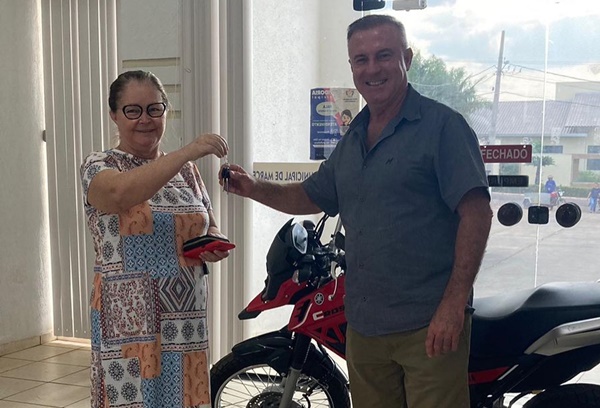 A ganhadora da motocicleta recebeu o prêmio das mãos do excelentíssimo Sr. Prefeito Celso Luiz Padovani.