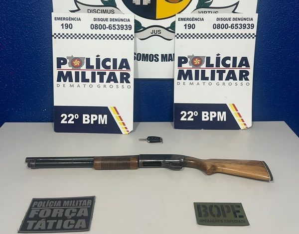 A “operação calvaria”, com apoio do bope/pmmt, atuando em suplementação ao efetivo do 15° comando regional, após diversas informações sobre possível atividades criminosas praticadas pelo suspeito 01, que estaria trafegando em vias públicas em uma caminhonete, GM-S10 de cor branca, sem placa traseira e com diversas avarias, portando uma arma de fogo, foram intensificadas rondas e abordagens pela circunscrição da cidade, sendo veículo visualizado, trafegando pelo Bairro Mãe de Deus, onde foi realizada a abordagem ao utilitário na Avenida Brasil, em frente a um mercado naquela localidade, em cujo interior, foram encontrados os dois suspeitos, bem como, a arma de fogo, tipo espingarda, calibre ’12’, com numeração suprimida, estando no banco traseiro, ao alcance de quaisquer dos ocupantes. em face da prática delitiva ocorrente os suspeitos foram detidos e apresentados na delegacia de polícia judiciária civil de Peixoto de Azevedo para lavratura do auto de prisão em flagrante.
