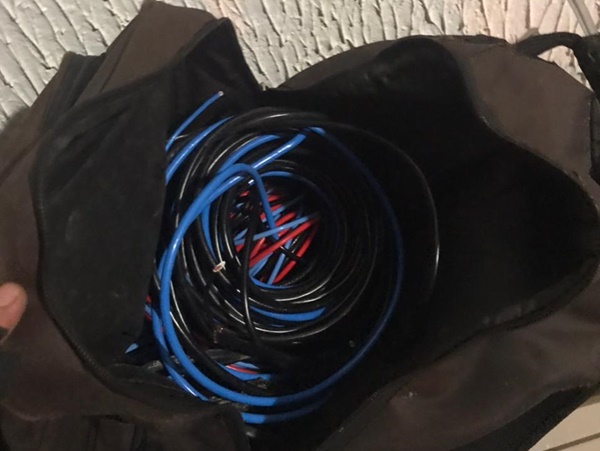 No momento da prisão, foi encontrado em posse do infrator da lei uma mochila com vários fios de cobres, bem como uma faca utilizada para atividade ilícita.
