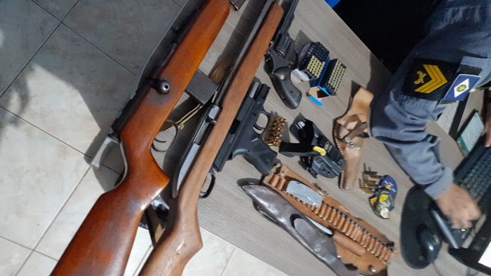 Diante da denúncia a Polícia Militar composta pelo 3º SGT PM Natanael e SD PM Parode intensificou as abordagens nas imediações, bem como nos estabelecimentos comercias noturno e que em um bar denominado Bar da Jhuly foram abordados diversas pessoas onde foi logrado o êxito em localizar na cintura de um cidadão (suspeito) um revolver calibre ‘.22’ municiado com todas as munições intactas; que durante a revista no veiculo do suspeito um Fiat Uno foi encontrado mais 02 (duas) armas de fogo tipo espingarda calibre “38” tipo carabina de ferrolho com 01 (um) carregador municiado com numeração ilegível, 01(uma) espingarda Calibre “.22” Marlin com numeração ilegível.