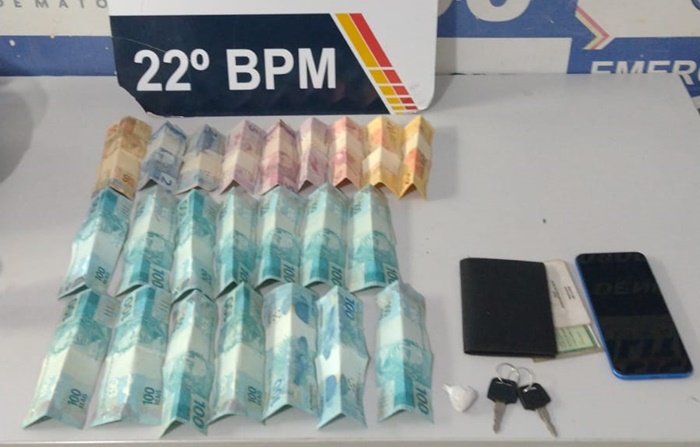 Foi encontrado no bolso traseiro do shorts do suspeito um involucro de substancia análoga a maconha, e em sua carteira a quantia aproximada de R$1.509,00 (mil quinhentos e nove reais em espécie). O suspeito foi encaminhado para a delegacia polícia civil local. Obs: a motocicleta foi apreendida encaminhado a CIRETRAN.