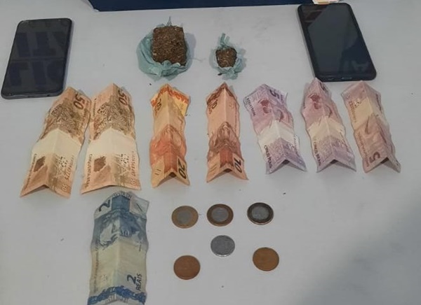 Após realizada a busca pessoal em ambos suspeitos foi verificado que o objeto dispensado tratava-se de duas porções análogas a maconha.
