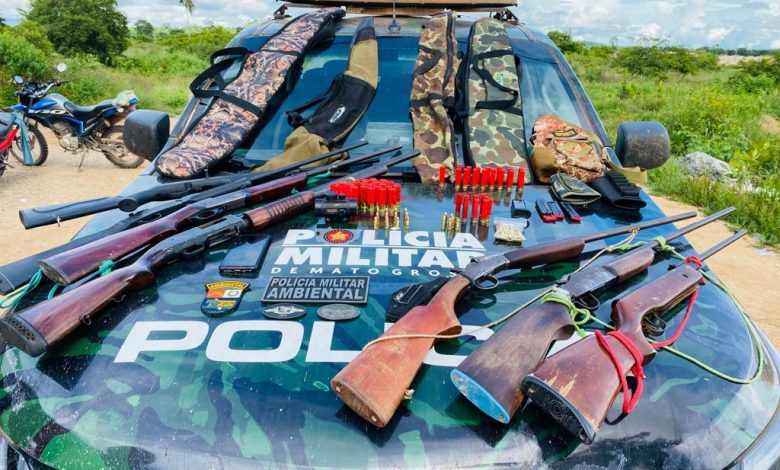 Os policiais identificaram também três pessoas nas proximidades do alojamento, duas delas foragiram para uma região de mata. O terceiro suspeito foi contido pela PM. Os policiais apreenderam sete espingardas de diversos calibres, uma pistola Taurus G2C 9 milímitros com 03 carregadores, uma mira holográfica marca Rossi e 151 munições.