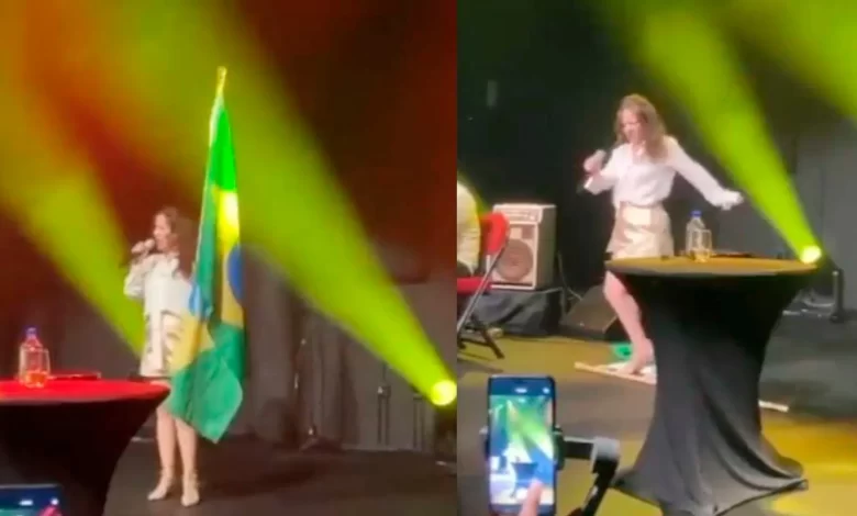 Bebel, filha do cantor João Gilberto, pisa na bandeira do Brasil durante show