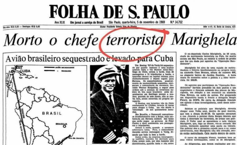 O deputado Eduardo Bolsonaro compartilhou uma capa do jornal Folha de S.Paulo de 1969 com a morte de Carlos Marighella como manchete. O parlamentar chamou atenção para o fato de que o veículo se referiu ao guerrilheiro como “terrorista”.